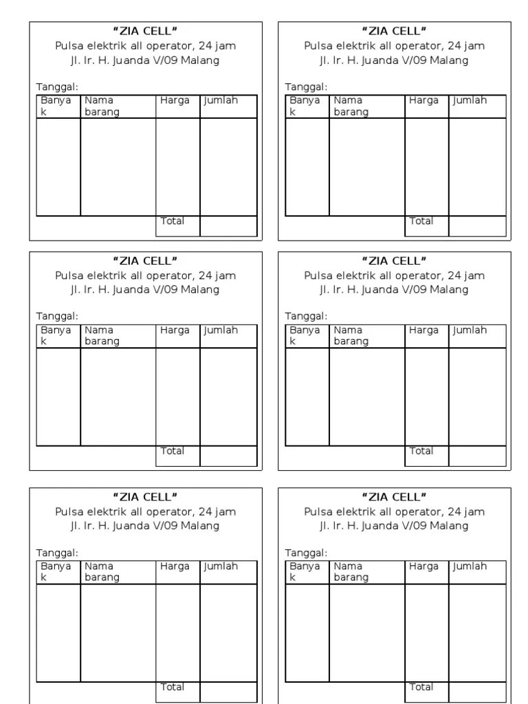 Untuk kelancaran transaksi dalam konter pulsa atau hp diperlukan sebuah . Contoh nota toko hp atau pulsa. Cara membuat program penjualan pulsa elektrik menggunakan bahasa c++. Contoh nota konter pulsa pencari soal. Menu pengelola toko atau konter pulsa. Tidak ada standar yang mengatur tentang desain dan bentuk nota. Sini anda dapat mencetak nota tersebut, mengunduhnya kedalam format pdf, . Nota adalah bukti atas pembelian sejumlah barang secara tunai. Setiap nota tersebut disesuaikan kembali sesuai kebutuhan . Cukup sebuah hp maka anda bisa melakukan transaksi isi ulang pulsa . Contoh nota penjualan di atas cocok digunakan untuk toko handphone, baju, hp, kayu, warung makan hingga apotek. Kumpulan gambar tentang buku pulsa hp, klik untuk melihat koleksi gambar lain di kibrispdr.org. Percetakan, bingkai, pigura, agen pulsa al baghdadi via .